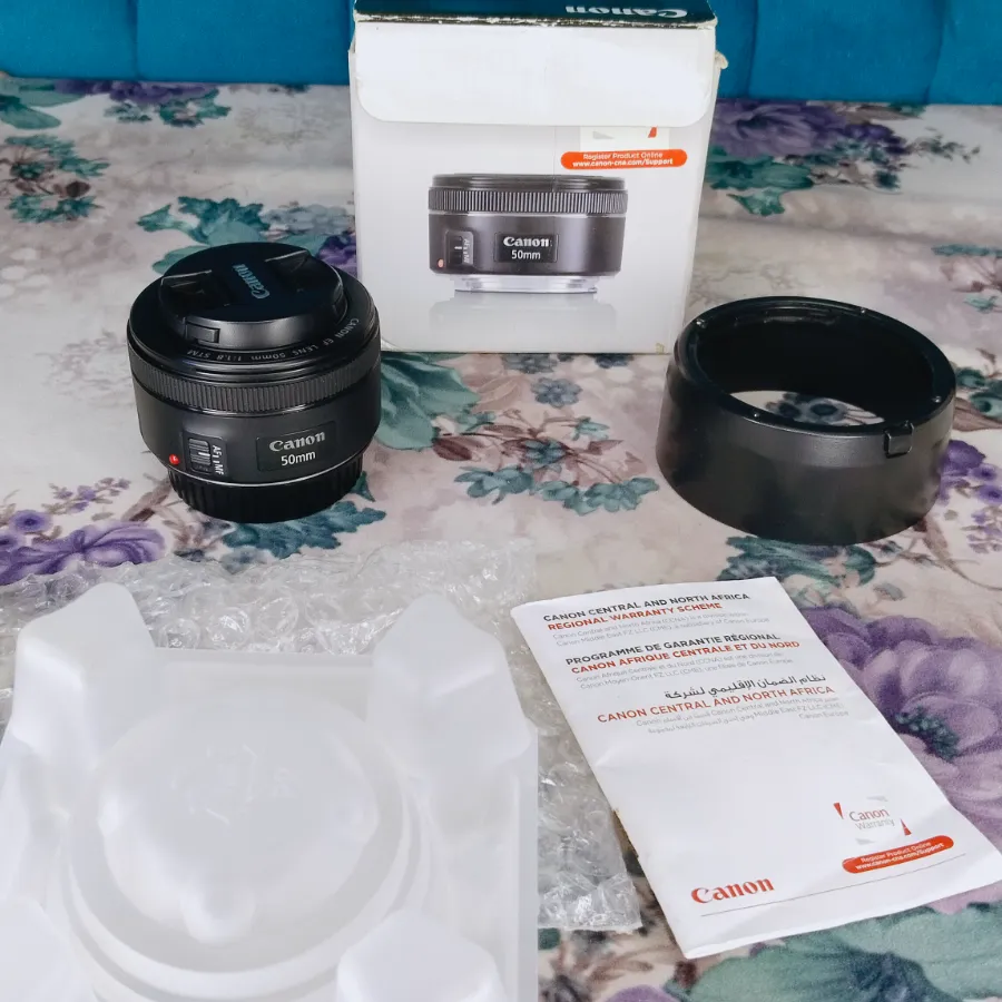 عدسه كانون 50mm F 1.8 G STM زيرو بلمعت بلدها والضمان والكتلوج والكرتونه والكاب الامامي والكاب الخلفي وهوت وفلترVU كلو زيرو حرفيا بكيسها