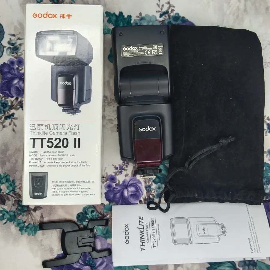 فلاش جودكس TT520 II كسر زيرو بكل مشتملتها الكرتونه الجراب القماش قطعه اللي بتركب علي الترايبود الكتلوج الفلاش بحلتو زيرو إضاءة قويه جدا