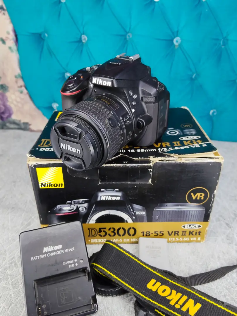 كاميرا نيكون D5300 كسر زيرو بكل مشتملتها ( الكرتونه - حزام - بطاريه - شاحن - كاب الكاميرا - عدسه 18.55 II VR بتشتغل اتوماتيك ومانيوال معاها الكاب الامامي الكاميرا بلمعت بلدها لسه زي ما موضح في الصور للتواصل واتساب او فون 0️⃣1️⃣0️⃣9️⃣5️⃣1️⃣9️⃣0️⃣2️⃣0️⃣8️⃣