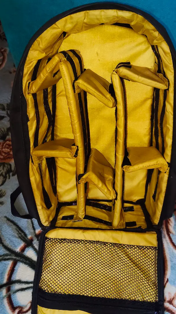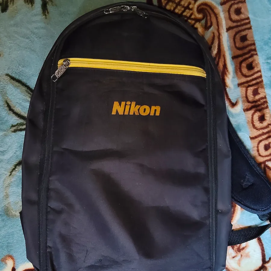 شنطه ضهر كبيرة نيكون بتاخد كاميرا و3عدسات وفلاش وشواحن بها جيوب لكروت الميموري والبطريات للتواصل واتسات او فون ولا